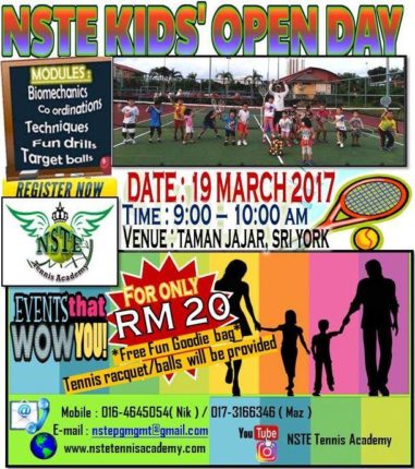 Date: 19 March 2017 Time: 9AM to 10AM Venue: Taman Jajar, Sri York Fee: RM20 FREE Goodie Bag Tennis racquet & Balls will be provided Register Now from: Mobile: 016-4645054(Nik) or 017-3166346(Maz) NSTE Kids’ Open Day is back for year 2017. We have so much more to share with you on this special event. Be […]