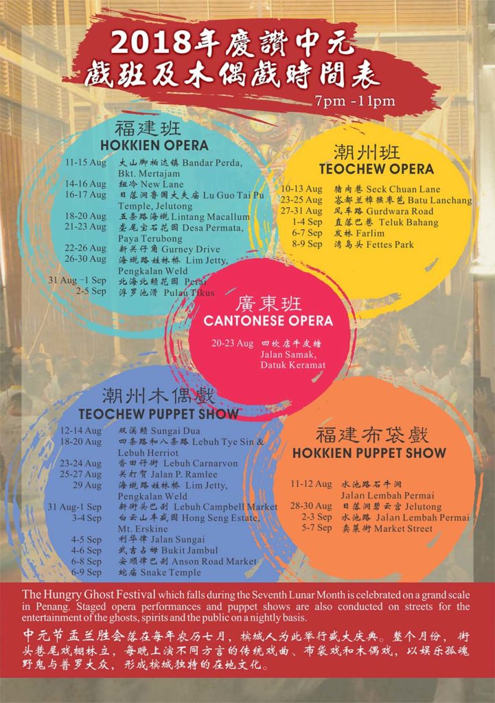 The Hungry Ghost Festival which falls during the Seventh Lunar Month is celebrated on a grand scale in Penang. During this month, it is believed that the Gates of Hell are thrown open for spirits and ghosts from the netherworld to roam freely in search for food. Thus, Makeshift altars are erected at roadsides where giant joss stick are lit and food is offered to appease their hunger. Staged opera performances and puppet shows are also conducted at these venues for the entertainment of the ghosts, spirits and the public on a nightly basis.
